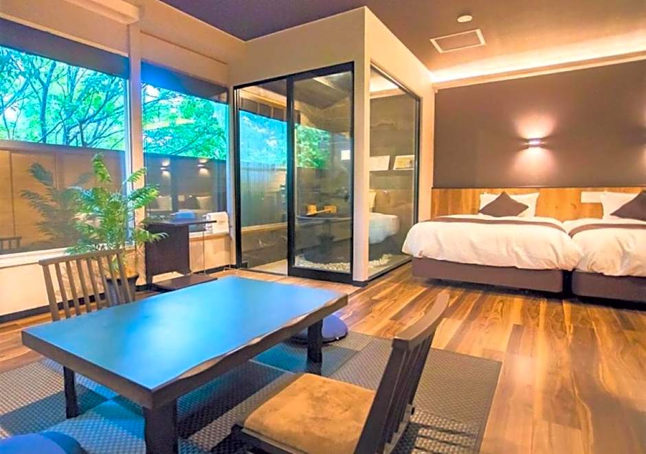Guests will have a special experience as the twin/double room offers a private open-air bath. The spacious twin/double room provides air conditioning, tatami, as well as a private bathroom featuring a bath and a shower. The unit offers 2 beds and 1 futon.